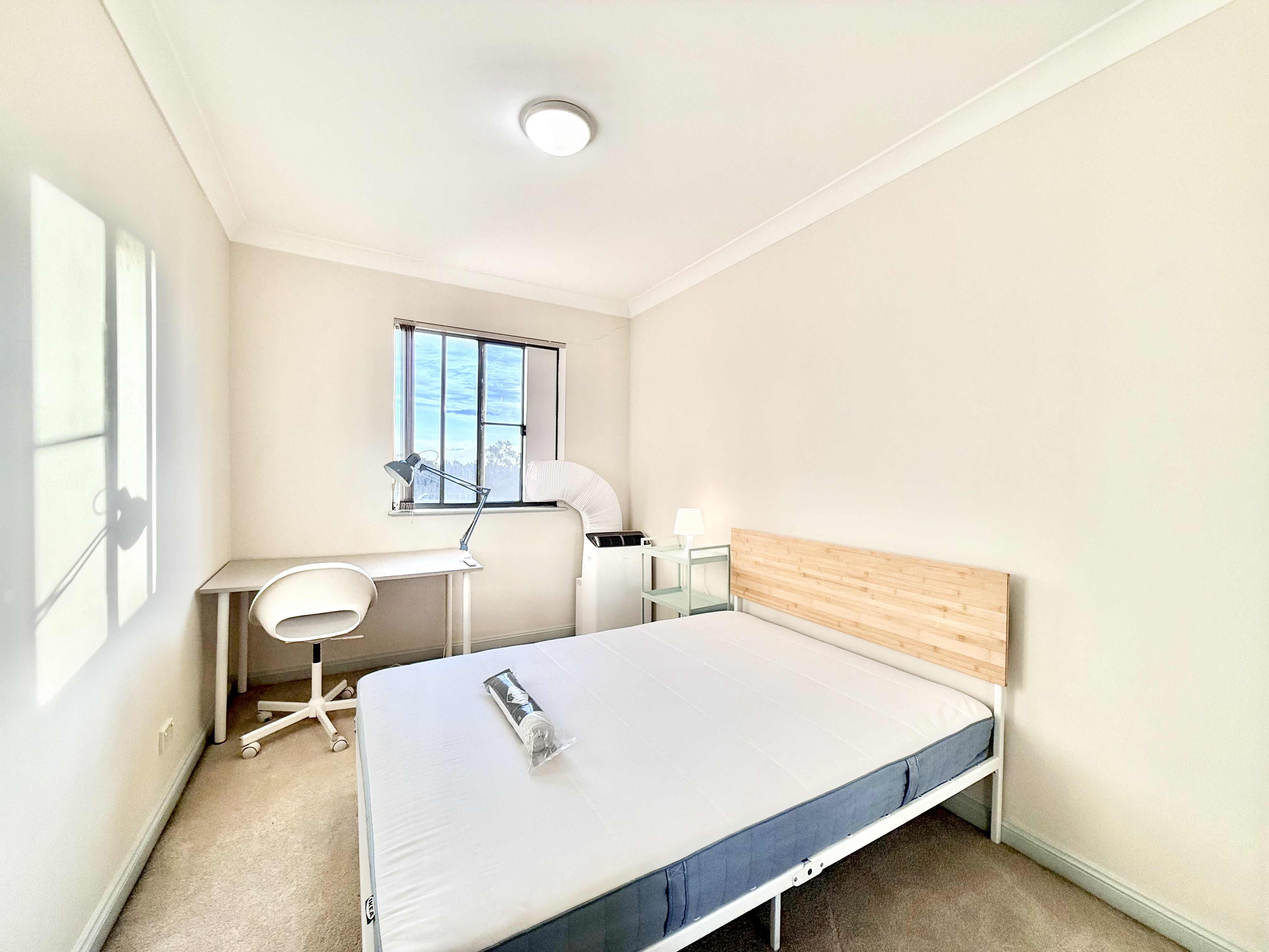 - 次卧Room2:正常卧室大小,朝西,可住1-2人,带镜子的嵌入式大衣柜。家具配置:Double size双人床、舒适护脊床垫、书桌、可升降转椅、学习灯、床头柜、台灯。